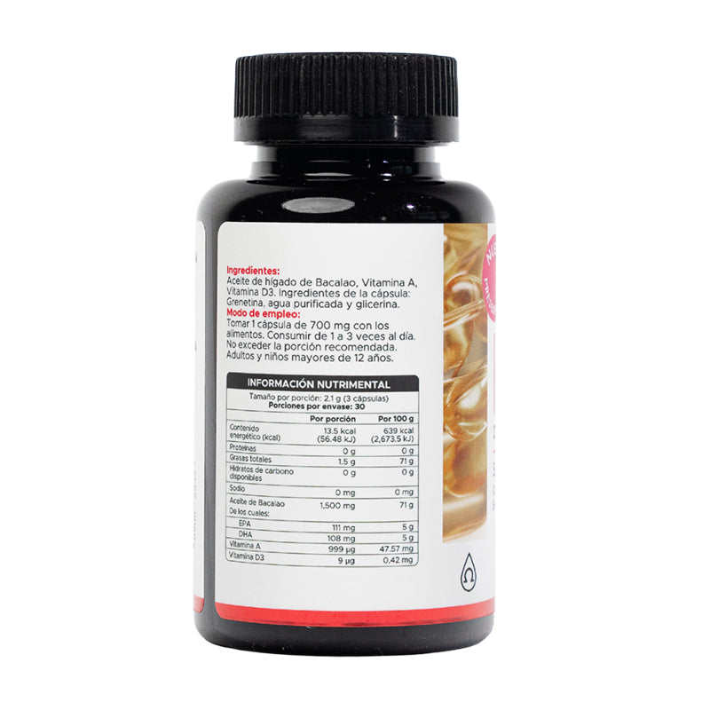 Aceite de hígado de Bacalao, Vitamina A, Vitamina D3. Ingredientes de la cápsula: Grenetina, agua purificada y glicerina.