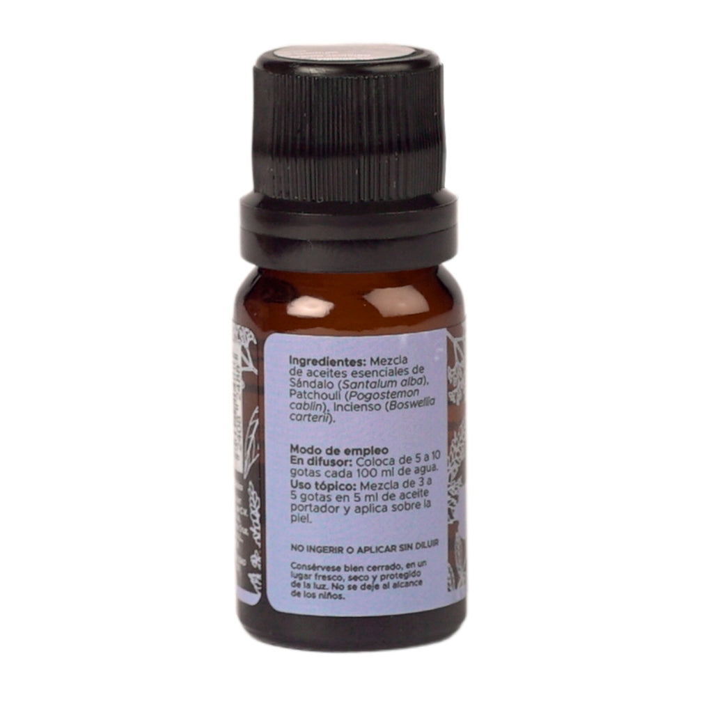 Mezcla de aceites esenciales de: Sándalo (Santalum alba), Patchouli (Pogostemon cablin), Incienso (Boswellia carterii).